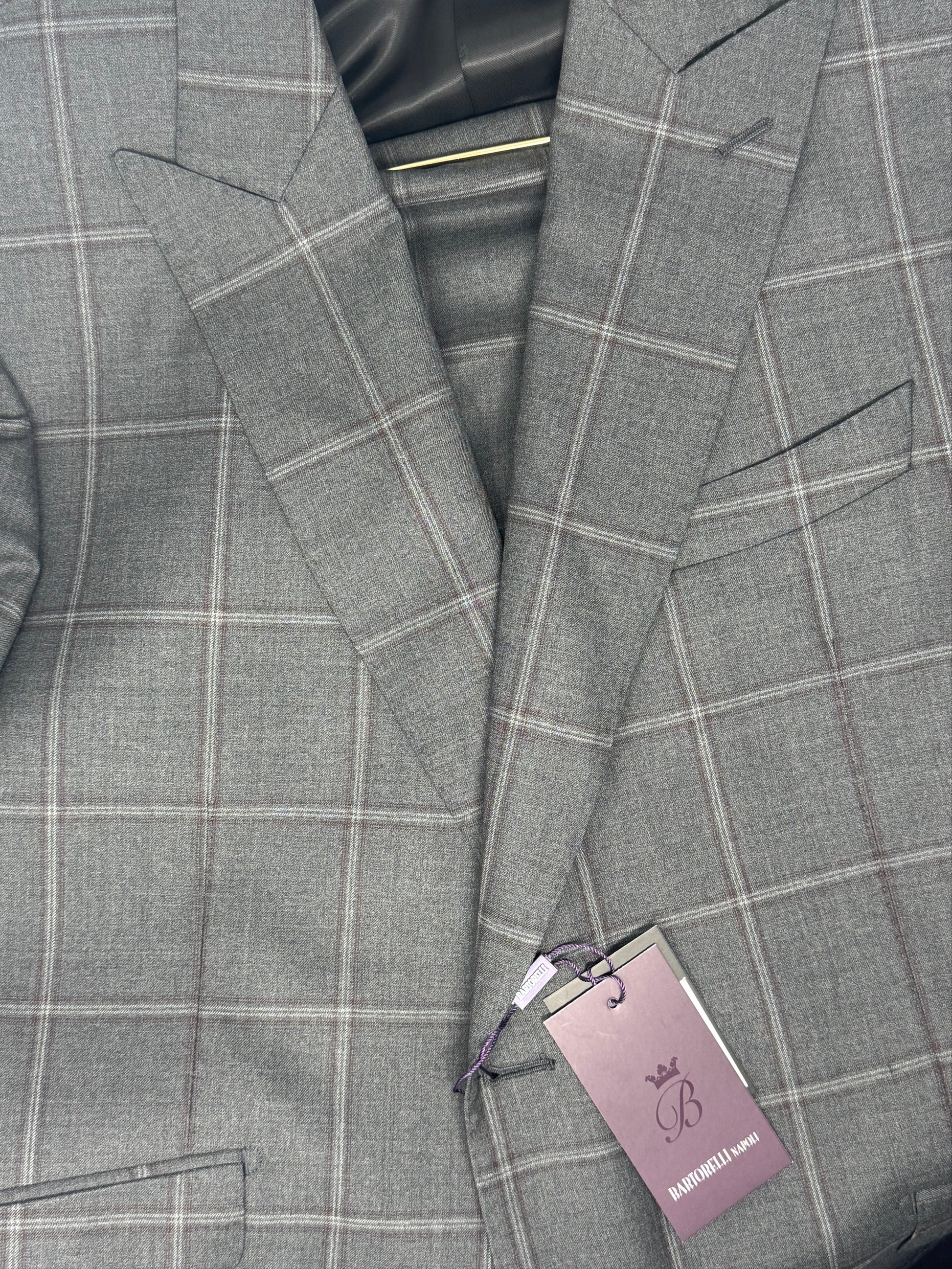 Bartorelli Mens Wool Suit Grey Maroon Plaid Peak Lapel BA13215-2