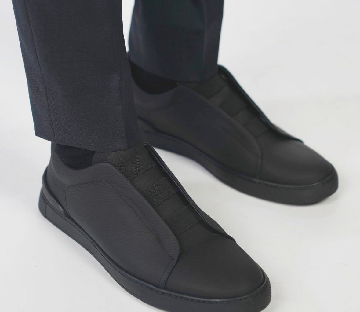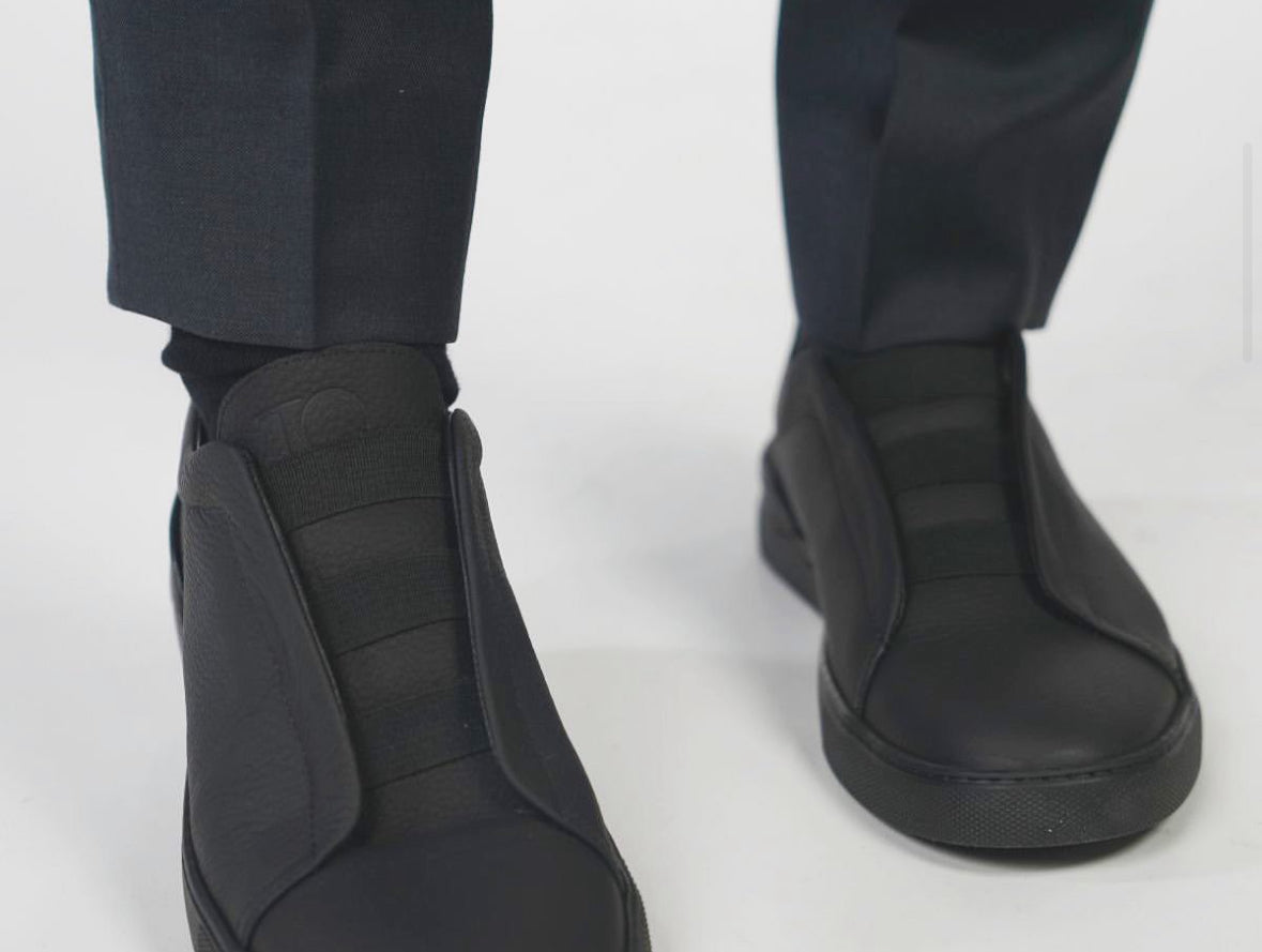 Crafted from specially selected black pebble-leather, our Sneaker Shoes deliver a glove‑like fit and exceptional flexibility. The signature triple elastic detail ensures effortless slip‑on ease, while they seamlessly transition from casual to dressy. Super‑soft, ultralight uppers rest atop a crisp rubber sole for responsive cushioning with every step.
